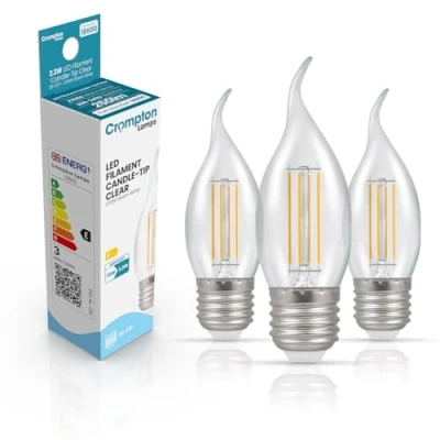 This Crompton Lamps 2.2W LED candle light bulb with a ES-E27 Edison screw (27mm) fitting is a direct replacement for a traditional 25W light bulb, but has the potential to reduce your home lighting bills and reduce the frequency of needing to replace your light bulbs.LED filament technology is much more energy efficient than traditional light bulb technologies such as incandescent bulbs. This not only helps you save on your energy bills but also helps the environment too.Whereas a traditional light bulb would use 25W to produce 250lm, this LED version uses just 2.2W equating to an energy-efficiency of 113.64lm/W.The beauty of LED filament light bulbs is truly enchanting, seamlessly blending vintage aesthetics with cutting-edge technology. The LED filaments within these bulbs mimic the classic look of incandescent bulbs, casting a glow that exudes nostalgia. Furthermore, LED filament bulbs extend beyond their aesthetic appeal by providing both energy-efficient operation and long-lasting durability, thus positioning them as a sustainable and environmentally friendly lighting choice.With a clear glass finish, this light bulb is designed to recreate the look of traditional incandescent light bulbs.With a long life of 15,000-hours, this LED candle light bulb boasts an incredible 8.2-year lifespan if used for 5-hours a day. These light bulbs dont need to be replaced as often which results in less money spent on replacement bulbs, and less time spent replacing them, too.Combine this superior longevity, negligible maintenance and replacement costs with the LED light bulbs notable energy efficiency then the savings gleaned from each light bulb has the potential to reduce your lighting costs by up to 91%.Warm white (2700K) bulbs produce a warm, yellow light which is comparable to traditional incandescent bulbs and are most frequently used to create a relaxed atmosphere. This makes them great in any room in your home, but especially in rooms such as the living room or bedroom where you would like to create a comfy atmosphere.Unlike older other energy-saving technologies, LED bulbs light up instantly, with no waiting time to warm up to full brightness.With a size of 35mm diameter with 97mm height, this LED candle light bulb will retrofit directly to any existing ES-E27 fixture; whether that be smaller domestic light fittings such as chandeliers or wall sconces or up to large-scale commercial installations.