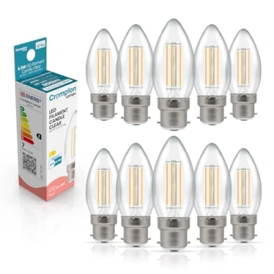 This Crompton Lamps 6.5W dimmable LED candle light bulb with a BC-B22d bayonet (22mm) fitting is a direct replacement for a traditional 60W light bulb, but has the potential to reduce your home lighting bills and reduce the frequency of needing to replace your light bulbs.LED filament technology is much more energy efficient than traditional light bulb technologies such as incandescent bulbs. This not only helps you save on your energy bills but also helps the environment too.Whereas a traditional light bulb would use 60W to produce 806lm, this LED version uses just 6.5W equating to an energy-efficiency of 124lm/W.The beauty of LED filament light bulbs is truly enchanting, seamlessly blending vintage aesthetics with cutting-edge technology. The LED filaments within these bulbs mimic the classic look of incandescent bulbs, casting a glow that exudes nostalgia. Furthermore, LED filament bulbs extend beyond their aesthetic appeal by providing both energy-efficient operation and long-lasting durability, thus positioning them as a sustainable and environmentally friendly lighting choice.With a clear glass finish, this light bulb is designed to recreate the look of traditional incandescent light bulbs.With a long life of 15,000-hours, this LED candle light bulb boasts an incredible 8.2-year lifespan if used for 5-hours a day. These light bulbs dont need to be replaced as often which results in less money spent on replacement bulbs, and less time spent replacing them, too.Combine this superior longevity, negligible maintenance and replacement costs with the LED light bulbs notable energy efficiency then the savings gleaned from each light bulb has the potential to reduce your lighting costs by up to 89%.This dimmable lamp features DuoDim™ Technology making it compatible with most leading and trailing edge dimmers; however, in testing, we have found that Varilight V-Pro dimmers produce the best dimming results.Cool white (4000K) bulbs produce a cooler, crisp light and are well suited to more stimulating environments. This makes them great in kitchens, workplaces and is also excellent for bathrooms as there is no colour cast; so applying makeup is much easier.Unlike older other energy-saving technologies, LED bulbs light up instantly, with no waiting time to warm up to full brightness.With a size of 35mm diameter with 97mm height, this LED candle light bulb will retrofit directly to any existing BC-B22d fixture; whether that be smaller domestic light fittings such as chandeliers or wall sconces or up to large-scale commercial installations.