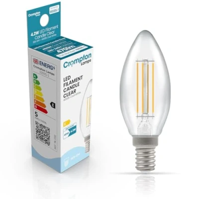 This Crompton Lamps 4.2W dimmable LED candle light bulb with a SES-E14 small Edison screw (14mm) fitting is a direct replacement for a traditional 40W light bulb, but has the potential to reduce your home lighting bills and reduce the frequency of needing to replace your light bulbs.LED filament technology is much more energy efficient than traditional light bulb technologies such as incandescent bulbs. This not only helps you save on your energy bills but also helps the environment too.Whereas a traditional light bulb would use 40W to produce 470lm, this LED version uses just 4.2W equating to an energy-efficiency of 111.9lm/W.The beauty of LED filament light bulbs is truly enchanting, seamlessly blending vintage aesthetics with cutting-edge technology. The LED filaments within these bulbs mimic the classic look of incandescent bulbs, casting a glow that exudes nostalgia. Furthermore, LED filament bulbs extend beyond their aesthetic appeal by providing both energy-efficient operation and long-lasting durability, thus positioning them as a sustainable and environmentally friendly lighting choice.With a clear glass finish, this light bulb is designed to recreate the look of traditional incandescent light bulbs.With a long life of 15000-hours, this LED candle light bulb boasts an incredible 8.2-year lifespan if used for 5-hours a day. These light bulbs dont need to be replaced as often which results in less money spent on replacement bulbs, and less time spent replacing them, too.Combine this superior longevity, negligible maintenance and replacement costs with the LED light bulbs notable energy efficiency then the savings gleaned from each light bulb has the potential to reduce your lighting costs by up to 90%.This dimmable lamp features DuoDim™ Technology making it compatible with most leading and trailing edge dimmers; however, in testing, we have found that Varilight V-Pro dimmers produce the best dimming results.Cool white (4000K) bulbs produce a cooler, crisp light and are well suited to more stimulating environments. This makes them great in kitchens, workplaces and is also excellent for bathrooms as there is no colour cast; so applying makeup is much easier.Unlike older other energy-saving technologies, LED bulbs light up instantly, with no waiting time to warm up to full brightness.With a size of 35mm diameter with 91mm height, this LED candle light bulb will retrofit directly to any existing SES-E14 fixture; whether that be smaller domestic light fittings such as chandeliers or wall sconces or up to large-scale commercial installations.