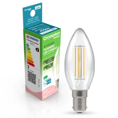 Our best low energy light bulb!Using the latest in LED filament technology, Crompton Lamps have released one of the UK's most energy efficient light bulb ranges yet. Designed to surpass all requirements of the new ERP energy requirements; these energy saving bulbs achieve the highest A rating possible with an amazing performance of over 214lm/W - meaning these low wattage light bulbs are more than 60% more efficient than regular LED light bulbs.At only 2.2W, this LED Candle light bulb could be one of the best LED light bulbs released to the market to date. It has been developed by Crompton Lamps as the most efficient way for replacing traditional incandescent light bulbs.Each light bulb in the range delivers massive cost savings due to it's low energy coupled with the same retro styling of old style light bulbs.These ultra efficient light bulbs utilise LED filaments, resulting in a gorgeous, traditional aesthetic that belies the light bulb's ultra-modern specification. These filaments, albeit similar in appearance, are much more efficient and robust than their traditional counterparts. They output a relaxing 3000K warm white colour with great colour rendering and no colour casting (as seen in the first generation of ultra-efficient LEDs).Whereas a traditional light bulb might use approximately 40W to produce 470 lumens, these ultra efficient LED Candle light bulbs use just 2.2W.Coupled with the light bulb's vastly superior lifetime of 50,000 hours - these energy efficient bulbs have the potential to last for many years to come and can reduce your lighting bills by up to 95%.This light bulb's 35mm diameter Candle shape and SBC-B15d small bayonet (15mm) cap will enable them to retrofit directly to any existing fitting designed to accept standard sized light bulbs.With electricity being one of the biggest household costs, finding simple swaps to reduce this energy consumption can have real impact on your cost of living. Low wattage LED bulbs are a brilliant alternative to traditional incandescent or halogen bulbs. Choosing the best energy saving light bulb can contribute to cheaper utility bills, as well as help you to reduce your carbon emissions by up to 40kg a year.