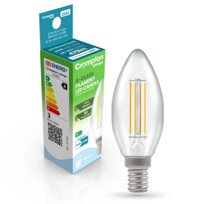 Our best low energy light bulb!Using the latest in LED filament technology, Crompton Lamps have released one of the UK's most energy efficient light bulb ranges yet. Designed to surpass all requirements of the new ERP energy requirements; these energy saving bulbs achieve the highest A rating possible with an amazing performance of over 214lm/W - meaning these low wattage light bulbs are more than 60% more efficient than regular LED light bulbs.At only 2.2W, this LED Candle light bulb could be one of the best LED light bulbs released to the market to date. It has been developed by Crompton Lamps as the most efficient way for replacing traditional incandescent light bulbs.Each light bulb in the range delivers massive cost savings due to it's low energy coupled with the same retro styling of old style light bulbs.These ultra efficient light bulbs utilise LED filaments, resulting in a gorgeous, traditional aesthetic that belies the light bulb's ultra-modern specification. These filaments, albeit similar in appearance, are much more efficient and robust than their traditional counterparts. They output a relaxing 3000K warm white colour with great colour rendering and no colour casting (as seen in the first generation of ultra-efficient LEDs).Whereas a traditional light bulb might use approximately 40W to produce 470 lumens, these ultra efficient LED Candle light bulbs use just 2.2W.Coupled with the light bulb's vastly superior lifetime of 50,000 hours - these energy efficient bulbs have the potential to last for many years to come and can reduce your lighting bills by up to 95%.This light bulb's 35mm diameter Candle shape and SES-E14 small Edison screw (14mm) cap will enable them to retrofit directly to any existing fitting designed to accept standard sized light bulbs.With electricity being one of the biggest household costs, finding simple swaps to reduce this energy consumption can have real impact on your cost of living. Low wattage LED bulbs are a brilliant alternative to traditional incandescent or halogen bulbs. Choosing the best energy saving light bulb can contribute to cheaper utility bills, as well as help you to reduce your carbon emissions by up to 40kg a year.