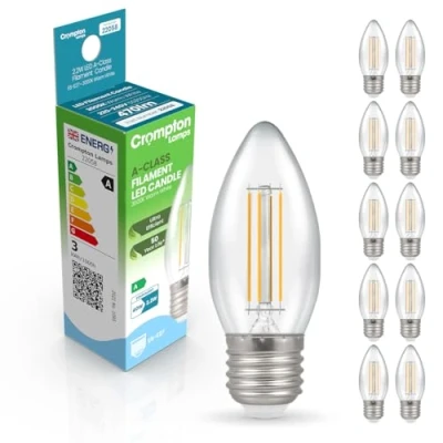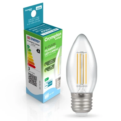 Our best low energy light bulb!Using the latest in LED filament technology, Crompton Lamps have released one of the UK's most energy efficient light bulb ranges yet. Designed to surpass all requirements of the new ERP energy requirements; these energy saving bulbs achieve the highest A rating possible with an amazing performance of over 214lm/W - meaning these low wattage light bulbs are more than 60% more efficient than regular LED light bulbs.At only 2.2W, this LED Candle light bulb could be one of the best LED light bulbs released to the market to date. It has been developed by Crompton Lamps as the most efficient way for replacing traditional incandescent light bulbs.Each light bulb in the range delivers massive cost savings due to it's low energy coupled with the same retro styling of old style light bulbs.These ultra efficient light bulbs utilise LED filaments, resulting in a gorgeous, traditional aesthetic that belies the light bulb's ultra-modern specification. These filaments, albeit similar in appearance, are much more efficient and robust than their traditional counterparts. They output a relaxing 3000K warm white colour with great colour rendering and no colour casting (as seen in the first generation of ultra-efficient LEDs).Whereas a traditional light bulb might use approximately 40W to produce 470 lumens, these ultra efficient LED Candle light bulbs use just 2.2W.Coupled with the light bulb's vastly superior lifetime of 50,000 hours - these energy efficient bulbs have the potential to last for many years to come and can reduce your lighting bills by up to 95%.This light bulb's 35mm diameter Candle shape and ES-E27 Edison screw (27mm) cap will enable them to retrofit directly to any existing fitting designed to accept standard sized light bulbs.With electricity being one of the biggest household costs, finding simple swaps to reduce this energy consumption can have real impact on your cost of living. Low wattage LED bulbs are a brilliant alternative to traditional incandescent or halogen bulbs. Choosing the best energy saving light bulb can contribute to cheaper utility bills, as well as help you to reduce your carbon emissions by up to 40kg a year.