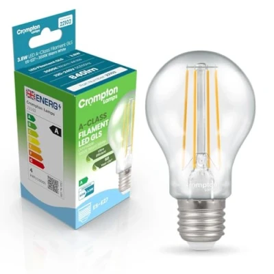 Our best low energy light bulb!Using the latest in LED filament technology, Crompton Lamps have released one of the UK's most energy efficient light bulb ranges yet. Designed to surpass all requirements of the new ERP energy requirements; these energy saving bulbs achieve the highest A rating possible with an amazing performance of over 226lm/W - meaning these low wattage light bulbs are more than 60% more efficient than regular LED light bulbs.At only 3.8W, this LED GLS light bulb could be one of the best LED light bulbs released to the market to date. It has been developed by Crompton Lamps as the most efficient way for replacing traditional incandescent light bulbs.Each light bulb in the range delivers massive cost savings due to it's low energy coupled with the same retro styling of old style light bulbs.These ultra efficient light bulbs utilise LED filaments, resulting in a gorgeous, traditional aesthetic that belies the light bulb's ultra-modern specification. These filaments, albeit similar in appearance, are much more efficient and robust than their traditional counterparts. They output a relaxing 3000K warm white colour with great colour rendering and no colour casting (as seen in the first generation of ultra-efficient LEDs).Whereas a traditional light bulb might use approximately 60W to produce 860 lumens, these ultra efficient LED GLS light bulbs use just 3.8W.Coupled with the light bulb's vastly superior lifetime of 50,000 hours - these energy efficient bulbs have the potential to last for many years to come and can reduce your lighting bills by up to 94%.This light bulb's 60mm diameter GLS shape and ES-E27 Edison screw (27mm) cap will enable them to retrofit directly to any existing fitting designed to accept standard sized light bulbs.With electricity being one of the biggest household costs, finding simple swaps to reduce this energy consumption can have real impact on your cost of living. Low wattage LED bulbs are a brilliant alternative to traditional incandescent or halogen bulbs. Choosing the best energy saving light bulb can contribute to cheaper utility bills, as well as help you to reduce your carbon emissions by up to 40kg a year.