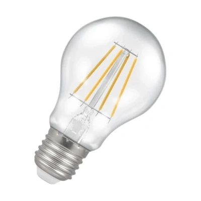 This Crompton Lamps 7W dimmable LED GLS light bulb with a ES-E27 Edison screw (27mm) fitting is a direct replacement for a traditional 60W light bulb, but has the potential to reduce your home lighting bills and reduce the frequency of needing to replace your light bulbs.LED filament technology is much more energy efficient than traditional light bulb technologies such as incandescent bulbs. This not only helps you save on your energy bills but also helps the environment too.Whereas a traditional light bulb would use 60W to produce 806lm, this LED version uses just 7W equating to an energy-efficiency of 115lm/W.The beauty of LED filament light bulbs is truly enchanting, seamlessly blending vintage aesthetics with cutting-edge technology. The LED filaments within these bulbs mimic the classic look of incandescent bulbs, casting a glow that exudes nostalgia. Furthermore, LED filament bulbs extend beyond their aesthetic appeal by providing both energy-efficient operation and long-lasting durability, thus positioning them as a sustainable and environmentally friendly lighting choice.With a long life of 10,000-hours, this LED GLS light bulb boasts an incredible 5.5-year lifespan if used for 5-hours a day. These light bulbs dont need to be replaced as often which results in less money spent on replacement bulbs, and less time spent replacing them, too.Combine this superior longevity, negligible maintenance and replacement costs with the LED light bulbs notable energy efficiency then the savings gleaned from each light bulb has the potential to reduce your lighting costs by up to 88%.This dimmable lamp features DuoDim™ Technology making it compatible with most leading and trailing edge dimmers; however, in testing, we have found that Varilight V-Pro dimmers produce the best dimming results.Warm white (2700K) bulbs produce a warm, yellow light which is comparable to traditional incandescent bulbs and are most frequently used to create a relaxed atmosphere. This makes them great in any room in your home, but especially in rooms such as the living room or bedroom where you would like to create a comfy atmosphere.Unlike older other energy-saving technologies, LED bulbs light up instantly, with no waiting time to warm up to full brightness.With a size of 60mm diameter with 104mm height, this LED GLS light bulb will retrofit directly to any existing ES-E27 fixture; whether that be smaller domestic light fittings such as ceiling lights or floor lamps or up to large-scale commercial installations.