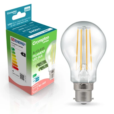 Our best low energy light bulb!Using the latest in LED filament technology, Crompton Lamps have released one of the UK's most energy efficient light bulb ranges yet. Designed to surpass all requirements of the new ERP energy requirements; these energy saving bulbs achieve the highest A rating possible with an amazing performance of over 226lm/W - meaning these low wattage light bulbs are more than 60% more efficient than regular LED light bulbs.At only 3.8W, this LED GLS light bulb could be one of the best LED light bulbs released to the market to date. It has been developed by Crompton Lamps as the most efficient way for replacing traditional incandescent light bulbs.Each light bulb in the range delivers massive cost savings due to it's low energy coupled with the same retro styling of old style light bulbs.These ultra efficient light bulbs utilise LED filaments, resulting in a gorgeous, traditional aesthetic that belies the light bulb's ultra-modern specification. These filaments, albeit similar in appearance, are much more efficient and robust than their traditional counterparts. They output a relaxing 3000K warm white colour with great colour rendering and no colour casting (as seen in the first generation of ultra-efficient LEDs).Whereas a traditional light bulb might use approximately 60W to produce 860 lumens, these ultra efficient LED GLS light bulbs use just 3.8W.Coupled with the light bulb's vastly superior lifetime of 50,000 hours - these energy efficient bulbs have the potential to last for many years to come and can reduce your lighting bills by up to 94%.This light bulb's 60mm diameter GLS shape and BC-B22d bayonet (22mm) cap will enable them to retrofit directly to any existing fitting designed to accept standard sized light bulbs.With electricity being one of the biggest household costs, finding simple swaps to reduce this energy consumption can have real impact on your cost of living. Low wattage LED bulbs are a brilliant alternative to traditional incandescent or halogen bulbs. Choosing the best energy saving light bulb can contribute to cheaper utility bills, as well as help you to reduce your carbon emissions by up to 40kg a year.