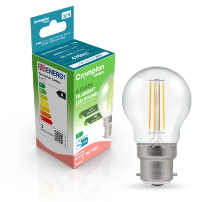 Our best low energy light bulb!Using the latest in LED filament technology, Crompton Lamps have released one of the UK's most energy efficient light bulb ranges yet. Designed to surpass all requirements of the new ERP energy requirements; these energy saving bulbs achieve the highest A rating possible with an amazing performance of over 214lm/W - meaning these low wattage light bulbs are more than 60% more efficient than regular LED light bulbs.At only 2.2W, this LED Golfball light bulb could be one of the best LED light bulbs released to the market to date. It has been developed by Crompton Lamps as the most efficient way for replacing traditional incandescent light bulbs.Each light bulb in the range delivers massive cost savings due to it's low energy coupled with the same retro styling of old style light bulbs.These ultra efficient light bulbs utilise LED filaments, resulting in a gorgeous, traditional aesthetic that belies the light bulb's ultra-modern specification. These filaments, albeit similar in appearance, are much more efficient and robust than their traditional counterparts. They output a relaxing 3000K warm white colour with great colour rendering and no colour casting (as seen in the first generation of ultra-efficient LEDs).Whereas a traditional light bulb might use approximately 40W to produce 470 lumens, these ultra efficient LED Golfball light bulbs use just 2.2W.Coupled with the light bulb's vastly superior lifetime of 50,000 hours - these energy efficient bulbs have the potential to last for many years to come and can reduce your lighting bills by up to 95%.This light bulb's 45mm diameter Golfball shape and BC-B22d bayonet (22mm) cap will enable them to retrofit directly to any existing fitting designed to accept standard sized light bulbs.With electricity being one of the biggest household costs, finding simple swaps to reduce this energy consumption can have real impact on your cost of living. Low wattage LED bulbs are a brilliant alternative to traditional incandescent or halogen bulbs. Choosing the best energy saving light bulb can contribute to cheaper utility bills, as well as help you to reduce your carbon emissions by up to 40kg a year.