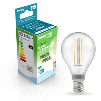 Our best low energy light bulb!Using the latest in LED filament technology, Crompton Lamps have released one of the UK's most energy efficient light bulb ranges yet. Designed to surpass all requirements of the new ERP energy requirements; these energy saving bulbs achieve the highest A rating possible with an amazing performance of over 214lm/W - meaning these low wattage light bulbs are more than 60% more efficient than regular LED light bulbs.At only 2.2W, this LED Golfball light bulb could be one of the best LED light bulbs released to the market to date. It has been developed by Crompton Lamps as the most efficient way for replacing traditional incandescent light bulbs.Each light bulb in the range delivers massive cost savings due to it's low energy coupled with the same retro styling of old style light bulbs.These ultra efficient light bulbs utilise LED filaments, resulting in a gorgeous, traditional aesthetic that belies the light bulb's ultra-modern specification. These filaments, albeit similar in appearance, are much more efficient and robust than their traditional counterparts. They output a relaxing 3000K warm white colour with great colour rendering and no colour casting (as seen in the first generation of ultra-efficient LEDs).Whereas a traditional light bulb might use approximately 40W to produce 470 lumens, these ultra efficient LED Golfball light bulbs use just 2.2W.Coupled with the light bulb's vastly superior lifetime of 50,000 hours - these energy efficient bulbs have the potential to last for many years to come and can reduce your lighting bills by up to 95%.This light bulb's 45mm diameter Golfball shape and SES-E14 small Edison screw (14mm) cap will enable them to retrofit directly to any existing fitting designed to accept standard sized light bulbs.With electricity being one of the biggest household costs, finding simple swaps to reduce this energy consumption can have real impact on your cost of living. Low wattage LED bulbs are a brilliant alternative to traditional incandescent or halogen bulbs. Choosing the best energy saving light bulb can contribute to cheaper utility bills, as well as help you to reduce your carbon emissions by up to 40kg a year.