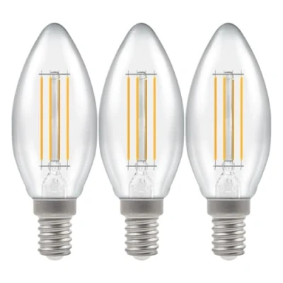 This Crompton Lamps 4.2W LED candle light bulb with a SES-E14 small Edison screw (14mm) fitting is a direct replacement for a traditional 40W light bulb, but has the potential to reduce your home lighting bills and reduce the frequency of needing to replace your light bulbs.LED filament technology is much more energy efficient than traditional light bulb technologies such as incandescent bulbs. This not only helps you save on your energy bills but also helps the environment too.Whereas a traditional light bulb would use 40W to produce 470lm, this LED version uses just 4.2W equating to an energy-efficiency of 111.9lm/W.The beauty of LED filament light bulbs is truly enchanting, seamlessly blending vintage aesthetics with cutting-edge technology. The LED filaments within these bulbs mimic the classic look of incandescent bulbs, casting a glow that exudes nostalgia. Furthermore, LED filament bulbs extend beyond their aesthetic appeal by providing both energy-efficient operation and long-lasting durability, thus positioning them as a sustainable and environmentally friendly lighting choice.With a clear glass finish, this light bulb is designed to recreate the look of traditional incandescent light bulbs.With a long life of 15,000-hours, this LED candle light bulb boasts an incredible 8.2-year lifespan if used for 5-hours a day. These light bulbs dont need to be replaced as often which results in less money spent on replacement bulbs, and less time spent replacing them, too.Combine this superior longevity, negligible maintenance and replacement costs with the LED light bulbs notable energy efficiency then the savings gleaned from each light bulb has the potential to reduce your lighting costs by up to 90%.Cool white (4000K) bulbs produce a cooler, crisp light and are well suited to more stimulating environments. This makes them great in kitchens, workplaces and is also excellent for bathrooms as there is no colour cast; so applying makeup is much easier.Unlike older other energy-saving technologies, LED bulbs light up instantly, with no waiting time to warm up to full brightness.With a size of 35mm diameter with 97mm height, this LED candle light bulb will retrofit directly to any existing SES-E14 fixture; whether that be smaller domestic light fittings such as chandeliers or wall sconces or up to large-scale commercial installations.
