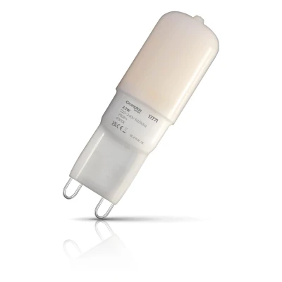 An energy-efficient LED G9 light bulb from Crompton Lamps. These bulbs offer a versatile lighting solution, perfect for a wide range of applications, from accent and desk lighting to pendant fixtures and cabinet illumination.The compact and adaptable design of these LED G9 bulbs makes them a popular choice for both residential and commercial spaces. Whether you're enhancing the ambiance of your living room, providing focused task lighting in your workspace, or creating an inviting atmosphere in a bar, restaurant, or hotel, these bulbs deliver exceptional performance.Designed as a direct replacement for 18W halogen G9 bulbs, these 2.2W LED G9 bulbs emit 200lm of cool white light (4000K) that mirrors the quality and brightness of traditional halogens, creating a cosy and inviting atmosphere. Enjoy the familiar glow you love while significantly reducing your energy consumption.Experience the benefits of long-lasting, energy-efficient lighting. With a nominal lifespan of 25000 hours, these LED G9 bulbs last up to 13 times longer than their halogen counterparts, minimizing replacement frequency and maintenance costs. The opal/frosted finish ensures a smooth, even light distribution, eliminating harsh shadows and creating a consistent, pleasing glow.These bulbs are designed to retrofit seamlessly into existing G9 fixtures, thanks to their comparable dimensions and classic frosted finish. The 2-pin push-fit base (pins measuring 9mm apart) ensures easy installation.