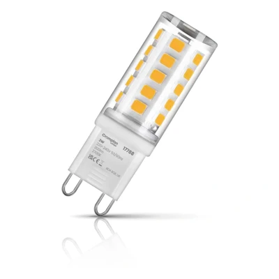 An energy-efficient LED G9 light bulb from Crompton Lamps. These bulbs offer a versatile lighting solution, perfect for a wide range of applications, from accent and desk lighting to pendant fixtures and cabinet illumination.The compact and adaptable design of these LED G9 bulbs makes them a popular choice for both residential and commercial spaces. Whether you're enhancing the ambiance of your living room, providing focused task lighting in your workspace, or creating an inviting atmosphere in a bar, restaurant, or hotel, these bulbs deliver exceptional performance.Designed as a direct replacement for 28W halogen G9 bulbs, these 3W LED G9 bulbs emit 300lm of warm white light (2700K) that mirrors the quality and brightness of traditional halogens, creating a cosy and inviting atmosphere. Enjoy the familiar glow you love while significantly reducing your energy consumption.Experience the benefits of long-lasting, energy-efficient lighting. With a nominal lifespan of 25000 hours, these LED G9 bulbs last up to 13 times longer than their halogen counterparts, minimizing replacement frequency and maintenance costs. The clear glass bulb allows the filament to be visible, adding a decorative touch and visual interest to your lighting fixtures.These bulbs are designed to retrofit seamlessly into existing G9 fixtures, thanks to their comparable dimensions and classic frosted finish. The 2-pin push-fit base (pins measuring 9mm apart) ensures easy installation.