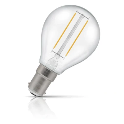 This Crompton Lamps 2.2W LED golfball light bulb with a SBC-B15d small bayonet (15mm) fitting is a direct replacement for a traditional 25W light bulb, but has the potential to reduce your home lighting bills and reduce the frequency of needing to replace your light bulbs.LED filament technology is much more energy efficient than traditional light bulb technologies such as incandescent bulbs. This not only helps you save on your energy bills but also helps the environment too.Whereas a traditional light bulb would use 25W to produce 250lm, this LED version uses just 2.2W equating to an energy-efficiency of 113.64lm/W.The beauty of LED filament light bulbs is truly enchanting, seamlessly blending vintage aesthetics with cutting-edge technology. The LED filaments within these bulbs mimic the classic look of incandescent bulbs, casting a glow that exudes nostalgia. Furthermore, LED filament bulbs extend beyond their aesthetic appeal by providing both energy-efficient operation and long-lasting durability, thus positioning them as a sustainable and environmentally friendly lighting choice.With a clear glass finish, this light bulb is designed to recreate the look of traditional incandescent light bulbs.With a long life of 15,000-hours, this LED golfball light bulb boasts an incredible 8.2-year lifespan if used for 5-hours a day. These light bulbs dont need to be replaced as often which results in less money spent on replacement bulbs, and less time spent replacing them, too.Combine this superior longevity, negligible maintenance and replacement costs with the LED light bulbs notable energy efficiency then the savings gleaned from each light bulb has the potential to reduce your lighting costs by up to 91%.Cool white (4000K) bulbs produce a cooler, crisp light and are well suited to more stimulating environments. This makes them great in kitchens, workplaces and is also excellent for bathrooms as there is no colour cast; so applying makeup is much easier.Unlike older other energy-saving technologies, LED bulbs light up instantly, with no waiting time to warm up to full brightness.With a size of 45mm diameter with 80mm height, this LED golfball light bulb is a small round light bulb that will retrofit directly to any existing SBC-B15d fixture; whether that be smaller domestic light fittings such as bedside lamps or fixtures with limited space or up to large-scale commercial installations.