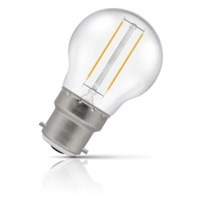 This Crompton Lamps 2.2W LED golfball light bulb with a BC-B22d bayonet (22mm) fitting is a direct replacement for a traditional 25W light bulb, but has the potential to reduce your home lighting bills and reduce the frequency of needing to replace your light bulbs.LED filament technology is much more energy efficient than traditional light bulb technologies such as incandescent bulbs. This not only helps you save on your energy bills but also helps the environment too.Whereas a traditional light bulb would use 25W to produce 250lm, this LED version uses just 2.2W equating to an energy-efficiency of 113.64lm/W.The beauty of LED filament light bulbs is truly enchanting, seamlessly blending vintage aesthetics with cutting-edge technology. The LED filaments within these bulbs mimic the classic look of incandescent bulbs, casting a glow that exudes nostalgia. Furthermore, LED filament bulbs extend beyond their aesthetic appeal by providing both energy-efficient operation and long-lasting durability, thus positioning them as a sustainable and environmentally friendly lighting choice.With a clear glass finish, this light bulb is designed to recreate the look of traditional incandescent light bulbs.With a long life of 15,000-hours, this LED golfball light bulb boasts an incredible 8.2-year lifespan if used for 5-hours a day. These light bulbs dont need to be replaced as often which results in less money spent on replacement bulbs, and less time spent replacing them, too.Combine this superior longevity, negligible maintenance and replacement costs with the LED light bulbs notable energy efficiency then the savings gleaned from each light bulb has the potential to reduce your lighting costs by up to 91%.Cool white (4000K) bulbs produce a cooler, crisp light and are well suited to more stimulating environments. This makes them great in kitchens, workplaces and is also excellent for bathrooms as there is no colour cast; so applying makeup is much easier.Unlike older other energy-saving technologies, LED bulbs light up instantly, with no waiting time to warm up to full brightness.With a size of 45mm diameter with 80mm height, this LED golfball light bulb is a small round light bulb that will retrofit directly to any existing BC-B22d fixture; whether that be smaller domestic light fittings such as bedside lamps or fixtures with limited space or up to large-scale commercial installations.