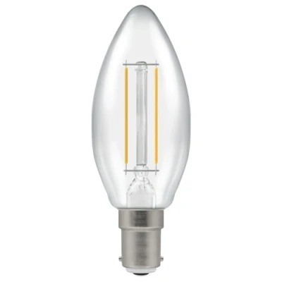 Dimmable LED filament 35mm candle lamp with clear finish. Energy saving LED 2700K warm white replacement lamp featuring LED filament technology. LEDs are arranged in a series filament arrangement, allowing true omni-directional light output. Designed to closely resemble the look and feel of a traditional incandescent lamp. Features DuoDim™ Technology: Compatible with both leading and trailing edge dimmers.15,000 hour life20,000 switching cyclesSBC-B15d cap2700K warm white colour temperatureColour rendering index ≥80Suitable for dimmingRecommended for indoor use onlyInstant full light3 year warrantyTechnical SpecificationLED Chip Type: LED (GaN) FilamentNotes: The lamp is compatible with most dimmer switches, please refer to website for up-to-date list of compatible dimmer switches.Nominal Voltage: 240VNominal Wattage: 2.5WNominal Luminous Flux: 250lmNominal Life: 15,000 hoursDimmable: DimmableCap Type: SBC-B15dEnergy Saving: YesEquivalent Wattage: 25W Traditional CandleEnergy Efficiency Class: FOperating Frequency: 50/60HzColour Temperature: 2700KColour Name: Warm WhiteDiameter: 35mmHeight: 95mmProduct Weight: 0.016kgTechnical Specification:Light Colour: Warm White Colour Temperature: 2700K Dimmable: YesDimensions: Length: 35mm x Height: 95mmWeight: 0.016KgWarranty: 3 Years
