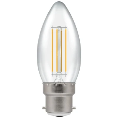 - 5,000 switching cycles- BC-B22d cap- 2700K warm white colour temperature- Colour rendering index ≥80- Suitable for dimmingDimmable LED filament 35mm candle lamp with clear finish. Energy saving LED 2700K warm white replacement lamp featuring LED filament technology. LEDs are arranged in a series filament arrangement, allowing true omni-directional light output. Designed to closely resemble the look and feel of a traditional incandescent lamp.Technical Specification:Cap Type: BC-B22dDimmable: DimmableNominal Wattage: 5WVoltage: 240VNominal Luminous Flux: 470lmColour Temperature: 2700KNominal Life: 10,000 HoursEnergy Rating: A+Equivalent Wattage: 40W Traditional CandleColour: Warm WhiteDiameter (mm): 35Material: GlassDimensions: Height: 91mm Weight: 0.016KgWarranty: 2 Years