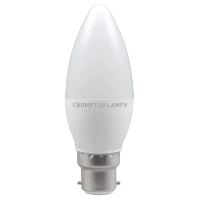 This Crompton Lamps 4.9W LED candle light bulb with a BC-B22d bayonet (22mm) cap is a retrofit replacement for a incandescent 40W light bulb, but has the potential to reduce your home lighting bills and reduce the frequency of needing to replace your light bulbs.LED technology has superior energy efficiency than traditional incandescent or halogen light bulbs which helps you save on your energy bills and helps the environment too.Whereas a traditional light bulb would use 40W to produce 470lm, this LED version uses just 4.9W equating to an excellent energy-efficiency of 96lm/W.This high-performance LED light bulb sports a thermal plastic body that is specifically designed to dissipate heat effectively. This reduces the light bulb's running temperature and places less strain on its components resulting in a longer life span.With a long life of 25,000-hours, this LED candle light bulb boasts an incredible 13.7-year lifespan if used for 5-hours a day. These light bulbs dont need to be replaced as often which results in less money spent on replacement bulbs, less time spent replacing them, and less old light bulbs going to landfill too.Combine this superior longevity, negligible maintenance and replacement costs with the LED light bulbs notable energy efficiency; then the savings from each light bulb has the potential to reduce your lighting costs by up to 88%.Daylight (6500K) bulbs replicate the natural light seen on an overcast day. This colour can be used for areas where accurate colour reproduction is required, such as task lighting, retail display and workplaces and displays colours naturally as if they were outside.Unlike older other energy-saving technologies, LED bulbs light up instantly, with no waiting time to warm up to full brightness.This LED candle light bulb will retrofit directly to any existing BC-B22d fixture; whether that be smaller domestic light fittings such as chandeliers or wall sconces or up to large-scale commercial installations.