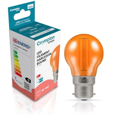 AmazonVIBRANT ORANGE LIGHT – Crompton Lamps Harlequin LED Golfball 4.5W B22 delivers a striking orange glow, perfect for festive décor, entertainment spaces, and themed lighting setups. IP65 WEATHERPROOF – Designed for indoor and outdoor use, this water-resistant LED light bulb is ideal for gardens, patios, and festoon lighting, withstanding the elements all year round. ENERGY-SAVING LED – This 4.5W LED bulb replaces a traditional 25W incandescent light bulb, reducing energy consumption by up to 82% vs outside lights mains powered incandescent light bulbs. LONG-LASTING PERFORMANCE – Boasting a 15,000-hour lifespan, these durable LED outside lights ensure a consistent, fade-resistant orange light over years of outdoor use. MULTIPURPOSE LIGHTING – Ideal for outdoor string lights, Christmas light bulbs, outdoor garden lights, events, and hospitality settings, adding a colourful, inviting atmosphere to any space., Weight: 0.03747858454 pounds, Manufacturer: Crompton Lamps