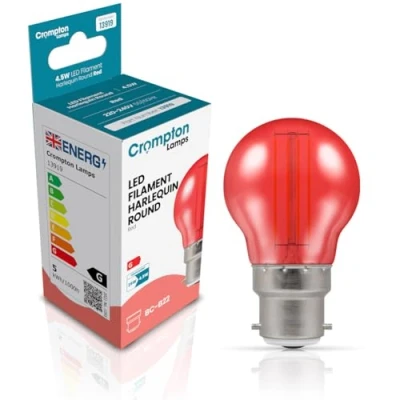 AmazonVIBRANT RED LIGHT – Crompton Lamps Harlequin LED Golfball 4.5W B22 delivers a striking red glow, perfect for festive décor, entertainment spaces, and themed lighting setups. IP65 WEATHERPROOF – Designed for indoor and outdoor use, this water-resistant LED light bulb is ideal for gardens, patios, and festoon lighting, withstanding the elements all year round. ENERGY-SAVING LED – This 4.5W LED bulb replaces a traditional 25W incandescent light bulb, reducing energy consumption by up to 82% vs outside lights mains powered incandescent light bulbs. LONG-LASTING PERFORMANCE – Boasting a 15,000-hour lifespan, these durable LED outside lights ensure a consistent, fade-resistant red light over years of outdoor use. MULTIPURPOSE LIGHTING – Ideal for outdoor string lights, Christmas light bulbs, outdoor garden lights, events, and hospitality settings, adding a colourful, inviting atmosphere to any space., Weight: 0.03747858454 pounds, Manufacturer: Crompton Lamps
