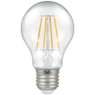 - 5,000 switching cycles- ES-E27 cap- 2700K warm white colour temperature- Colour rendering index ≥80- Suitable for dimmingDimmable LED filament 60mm GLS lamp with clear finish. Energy saving 2700K warm white LED replacement lamp featuring LED filament technology. LEDs are arranged in a series filament arrangement, allowing true omni-directional light output. Designed to closely resemble the look and feel of a traditional incandescent lamp.Technical Specification:Cap Type: ES-E27Dimmable: DimmableNominal Wattage: 5WVoltage: 240VNominal Luminous Flux: 470lmColour Temperature: 2700KNominal Life: 10,000 HoursEnergy Rating: A+Equivalent Wattage: 40W Traditional GLSColour: Warm WhiteDiameter (mm): 60Material: GlassDimensions: Height: 104mm Weight: 0.032KgWarranty: 2 Years