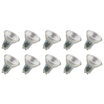 - 10,000 switching cycles- GU10 cap- 35° beam angle- 4000K cool white colour temperature- Colour rendering index ≥83Energy efficient LED retrofit GU10 lamp. Constructed from a full glass body to mimic the shape and size of a halogen GU10 lamp. Features the latest LED SMD (surface mounted) technology. Approximately equivalent to a 50W Halogen GU10 lamp. Suitable for use in fire rated downlights.Technical Specification:Cap Type: GU10Dimmable: Non-DimmableNominal Wattage: 4.5WVoltage: 240VNominal Luminous Flux: 360lmColour Temperature: 4000KBeam Angle: 35°Nominal Life: 15,000 HoursEnergy Rating: A+Equivalent Wattage: 50W Halogen GU10Colour: Cool WhiteDiameter (mm): 50Material: GlassDimensions: Height: 53mm Weight: 0.047KgWarranty: 3 Years