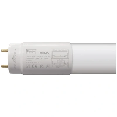 - 15,000 switching cycles- G13 cap- 6500K daylight colour temperature- Colour rendering index ≥80- Not suitable for dimmingLED T8 full glass tube. LED T8 full glass tube with internal diffused coating providing 320° light output. Energy saving with low power consumption. Includes LED starter for direct retrofit into existing single battens.Technical Specification:Cap Type: G13Dimmable: Non-DimmableNominal Wattage: 24WVoltage: 165-240VNominal Luminous Flux: 2550lmColour Temperature: 6500KBeam Angle: 320°Nominal Life: 40,000 HoursEnergy Rating: A+Equivalent Wattage: 58W 5ft Standard FluorescentProduct Type: TubeColour: DaylightDiameter (mm): 26Material: GlassDimensions: Length: 1500mm Weight: 0.255KgWarranty: 5 Years