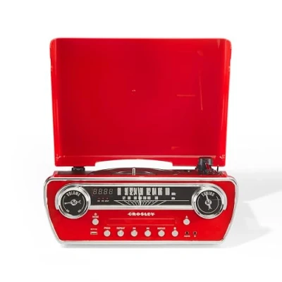 7 in 1 Music Player: Combining a 3-speed turntable, CD player, AM/FM radio, and Bluetooth connectivity in one stylish versatile unit; merging retro design with modern sound. Designed like the dashboard of a vintage car; a throwback to Crosley’s roots Wireless Freedom: Built-in Bluetooth technology enables seamless streaming to external speakers whilst allowing you to play your entire music collection from your mobile devices through the vinyl player's dynamic built-in speakers Multiple Speed Options: This turntable for vinyl records plays your treasured vinyl at 33 1/3, 45, and 78 RPM speeds, complete with auto-stop function and included 45 adapter for hassle-free listening sessions anytime Flexible Connectivity: RCA outputs connect to powered speakers, whilst the aux input and headphone jack offer additional listening options—ideal for private enjoyment or enhanced sound through your home audio setup Retro-Modern Design: Inspired by vintage car dashboards, this striking red vinyl record player merges classic aesthetics with modern functionality, making it both a stunning décor piece and reliable music centre