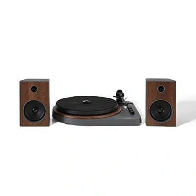 All In One Sound Setup: A vinyl player with speakers offering high-quality sound and style. The Bluetooth Record player features 33 1/3 & 45 RPM speed settings so you can adjust to any vinyl, and the included bookshelf speakers deliver true stereo audio Bluetooth Connectivity: Connect your mobile device via Bluetooth input to stream audio platforms directly through the turntable with speakers. Or, switch to Bluetooth output to wirelessly pair the turntable with any Bluetooth speakers or headphones Exceptional Sound: This record player with speakers delivers high-quality sound thanks to the adjustable counterweight and pre-mounted magnet cartridge. The belt-drive motor and adjustable pitch control make it easy to swtich between records Easy Setup: Just plug the Bluetooth record player in, slide on the counterbalance as far as it can go then tighten. Don’t worry about adjusting the tracking force or anti-skate - this is all pre-calibrated. Sync your speakers and you’re good to go Convenient Features: Experience crystal-clear audio with the dynamic built-in full-range stereo speakers. The built-in, switchable preamp allows you to easily pair with any stereo component of your choice.
