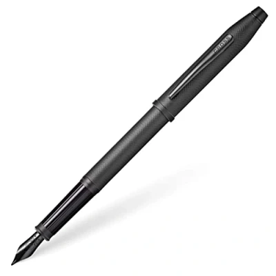 Black PVD micro-knurl finish with sandblasted matte black PVD appointments and a polished, finely-ribbed black grip; click-off cap Hand-finished, precision ground medium width stainless steel nib plated with polished black PVD Specially formulated ink flows flawlessly and dries quickly Includes two black fountain pen cartridges (#8921) that are as neat and easy to use as a ballpoint or rollerball refill; optional converter available (#8756) to fill pen from bottled ink Presented in a Cross luxury gift box and covered by a Lifetime Mechanical Warranty