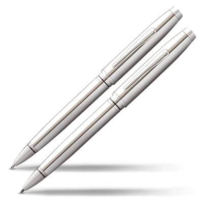 The perfectly coordinated Cross Coventry ballpoint pen and pencil writing set impresses with its classic profile, its strong shine and contrasting details Weightless writing feel with a high quality polished chrome finish. Elegant accents thanks to polished chrome fittings Stylish ballpoint pen with pivoting drive/rejection function. Refill type: #8513. Specially formulated cross ink flows flawlessly for a superior writing experience The refillable writing instrument makes a fantastic gift for any occasion Box contents: Cross Coventry writing set glossy chrome, ballpoint pen line width M = medium, lead: 8513 black, mechanical pencil, 3 0.7 mm pencils: 8742, an eraser: 8748, includes gift packaging