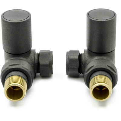 The Reina Crova Corner Radiator Valves pair features a chic anthracite finish, adding elegance to any room. Their 90 angled design promises easy installation, connecting seamlessly to parallel pipework. Compatible with most domestic radiators, they have 15mm inlet and outlet openings. Made from durable brass, these valves ensure reliable temperature control with round valve handles. They provide a sleek, professional finish to your radiator setup. A 1-year warranty further enhances their appeal, making them a dependable choice for enhancing the look and functionality of your radiator.. Reina Crova Corner Radiator Valves Pair - Anthracite Brass