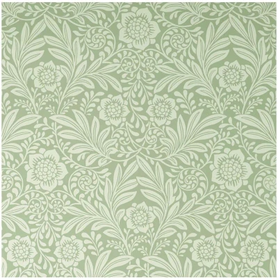 This truly timeless wallcovering captures the delicate and artistic beauty of classic design with its ornate, scrolling floral motif, perfect for introducing a serene and sophisticated elegance to any space. The pattern features densely interwoven stylized vines, blossoms, and stylized leaves that create a continuous, complex and harmonious display. Rendered in a soft, refreshing palette, the intricate pattern is set against a soothing green background, which gives the design a fresh, organic feel reminiscent of a tranquil English garden. The entire surface utilizes subtle shading and shadow to create a textured illusion of depth, ensuring the intricate design is gentle on the eye and allows the wallcovering to serve as a sophisticated backdrop rather than an overwhelming focal point. This paper is an ideal choice for a serene bedroom, an elegant dining nook, or a bright hallway where you desire enduring style and a tranquil atmosphere. The dense, traditional design offers a luxury