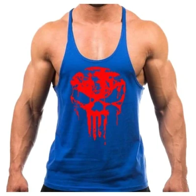 Crown Designs Skull Gym Bodybuilding Weight Training Sports Stringer Vest Top with Y Back Racerback Fit for Men & Teens Royal Red Design/X Large