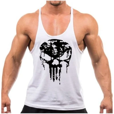 Crown Designs Skull Gym Bodybuilding Weight Training Sports Stringer Vest Top with Y Back Racerback Fit for Men & Teens White Black Design/Large