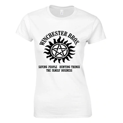 Crown Designs Winchester Brothers Horror Teen Fiction TV Show Inspired Gift for Women & Teenagers Fitted T Shirts Tops White/XL 12/14