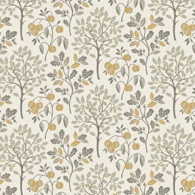 A vibrant and artistic design showcasing an array of fruit trees, amongst branches, acorns and leaves against a gentle textured effect. Seen here in the Natural colourway.