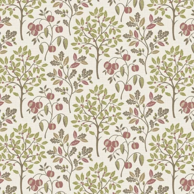A vibrant and artistic design showcasing an array of fruit trees, amongst branches, acorns and leaves against a gentle textured effect. Seen here in the Olive colourway.
