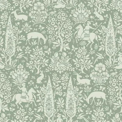 WallpaperDirectA pretty Persian style garden or woodland scene, with hunters on horseback, deer, stag, birds and rabbits in a stylised formal garden setting. Shown in the sage green colourway.