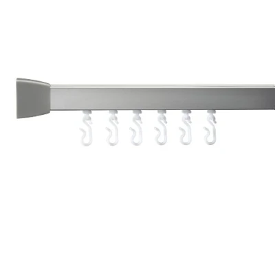 A lightweight but strong aluminium rail system Silver satin anodised aluminium rail, grey plastic wall brackets Pre-formed for perfect bends with a rigid 'H' section The system features a smooth running internal hook and glider system Supplied with twelve hooks and gliders for one shower curtain Rail size 24 x 14mm All fixings included