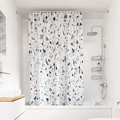 AmazonPREMIUM MATERIAL - Crafted from 100% polyester, this white shower curtain ensures durability and longevity. Its Proseal coated fabric provides excellent water repellency, making it an ideal addition to your bathroom decor. MACHINE WASHABLE - Our shower curtain is machine washable, promising easy cleaning and maintenance TRENDY DESIGN - Featuring a blue terrazzo pattern, this bathroom curtain adds a modern touch to your space. The extra long shower curtain measures 1800 x 1800mm, perfectly fitting a variety of shower setups. WEIGHTED HEM - It features a cling-resistant weighted hem, ensuring it stays in place during use, allowing for more movement in the shower. STAINLESS STEEL EYELETS - This extra long shower curtain features 12 corrosion-resistant stainless-steel eyelets, ensuring durability and easy installation.