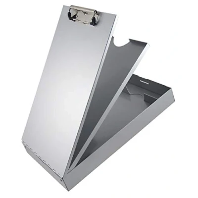 Low profile steel clip with rubber grip corners can securely hold up to 100 sheets of 20lb paper; stay organized so you can get work done Top-open dual tray design with 1. 5" internal storage capacity; light-weight aluminum base provides a sturdy writing surface while on the go or away from a desk Storage compartment keeps sensitive information protected from prying eyes; use this clipboard to compliment your HIPAA privacy program Made from 89% recycled aluminum with a minimum of 30% post-consumer recycled content; assembled in America from domestic and globally sourced components Clipboard measures 16. 25 in. x 9. 25 in. x 2. 25 in. (L x W x H) when laid flat on table; can fit documents and forms up to 8. 5 x 14 inches in size