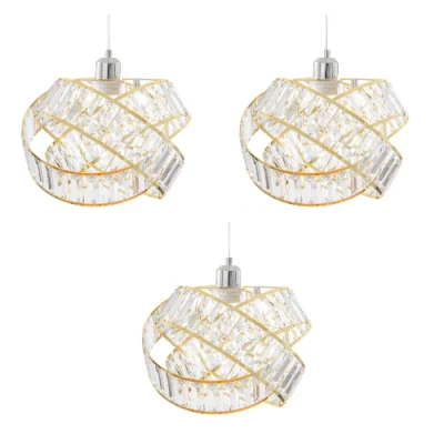Transform your room with a touch of contemporary sophistication with our eye-catching statement lamp shade. This unique design is crafted with durable plastic panels that mimic the brilliance of crystal, delivering a sleek and glamorous look. The shade features three gracefully interwoven circular shapes, creating an artistic silhouette that instantly becomes the focal point of any space. Available in two colours, soft grey and clear , so you have a choice to pick from, to suit your home style.. Perfect for adding a stylish edge to living rooms, bedrooms, dining areas, or even entryways, this lamp shade is not only visually stunning but also highly functional. It’s designed for easy installation on pendant fittings, but please ensure your pendant wiring is compatible with the weight of the shade, which is approximately 1.04kg.. Product Highlights:. Available in 3 colours: Soft Grey, Clear and Gold. Modern Design: Features overlapping circular shapes with a crystal-like finish for a luxurious yet minimalist aesthetic.. High-Quality Materials: Durable plastic panels provide long-lasting beauty and a lightweight structure.. Size: Measures approximately 31cm in diameter and 23cm in height, making it an ideal fit for standard rooms.. Bulb Compatibility: Suitable for bulbs up to 60W, allowing for ample brightness while maintaining energy efficiency.. Upgrade your lighting and make a bold statement with this contemporary crystal-effect lamp shade. Whether you're refreshing your home décor or looking for a standout piece, this shade offers both style and practicality.