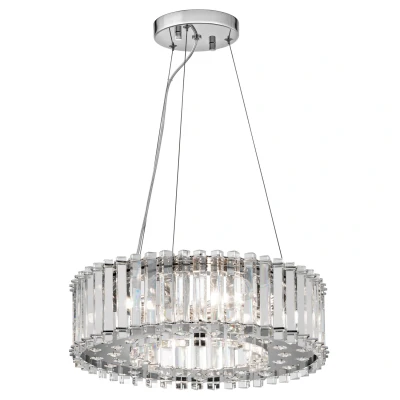 Net LightingThis ceiling pendant features triangular crystal prisms that rest inside Chrome details and stand ready to reflect light in a hundred different ways. Rounded crystals on the bottom reflect the inner light. Also available in this range; Island Chandelier, 2lt Wall Light, and 8lt Chandelier.