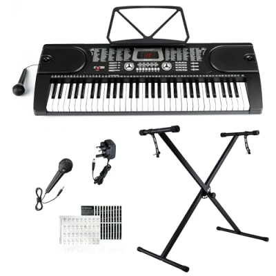 VOLUME CONTROL / HEADPHONE JACK - Adjust the master volume and accompaniment volume with the touch of a button and features to plug your headphones in for those late-night practice sessions. LCD SCREEN / POWER SAVING SLEEP MODE - Easy to read screen, display functions and programmed choice and also features with function of automatically shut down after 15 minutes of no use. 24 DEMONSTRATION SONGS / 255 TIMBERS / 255 RHYTHMS - Play along with a choice of 24 demonstration songs, up to 255 timbers change the sound of the keyboard keys and sync your music to 255 rhythms such as 'pop', 'jazz' and 'reggae' or programmed up to 32 of your own rhythms BUILT IN SPEAKERS / PERCUSSION / UK MAINS PLUG & MUCH MORE: BUILT IN SPEAKERS - Invite your family and friends to listen to your music and features with auto bass chords are marked out to help you learn, 8 panel percussion and 61 keyboard percussion, adjustable tempo to increase or decrease the speed of the demonstration songs and UK Mains Plug ADJUSTABLE HEIGHT SINGLE BRACED KEYBOARD STAND: - 7 adjustable height positions to meet your needs better. High quality iron structure for strength and durability. Quick and easy to assemble and includes assembly instructions - Black