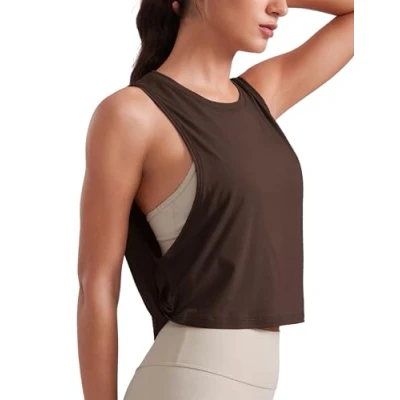 CRZ Yoga Pima Cotton Summer Gym Sleeveless Vest Tops for Women Light Elastic Running Crop Top Loose Crew Neck Shirt Hot Fudge Brown 10