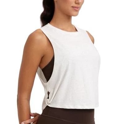 Designed for low-impact workouts or daily wear Super soft, skin-friendly and lightweight fabric keeps you comfortable Loose fit, crop length Round neck with knotted side details for a cute fashion look Sleeveless workout clothes with roomy arm hole for free movement