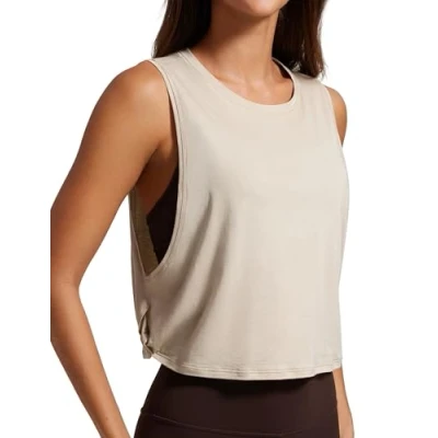 CRZ Yoga Pima Cotton Summer Gym Sleeveless Vest Tops for Women Light Elastic Running Crop Top Loose Crew Neck Shirt Mojave Tan 16