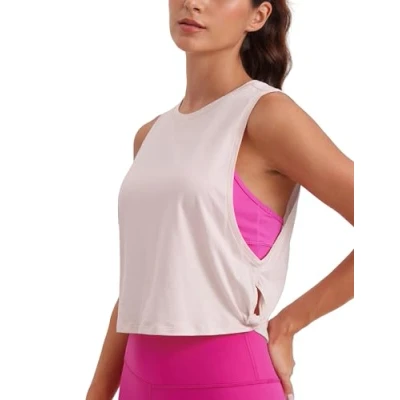 CRZ Yoga Pima Cotton Summer Gym Sleeveless Vest Tops for Women Light Elastic Running Crop Top Loose Crew Neck Shirt Smoky Blush 16