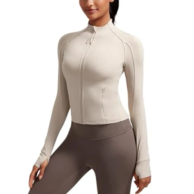 CRZ YOGA Women's Butterluxe Full Zip Running Jacket Pockets Outdoor Sports Cropped Jackets Gym Long Sleeve Top with Thumb Holes Mojave Tan 6