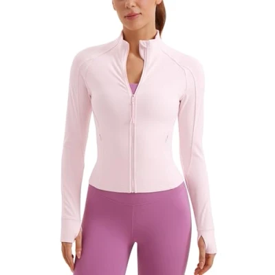 CRZ YOGA Women's Butterluxe Full Zip Running Jacket Pockets Outdoor Sports Cropped Jackets Gym Long Sleeve Top with Thumb Holes Strawberry Pink 14