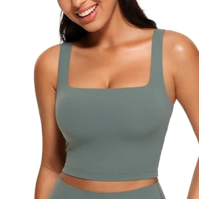 CRZ YOGA Women's Butterluxe Square Neck Sports Bra Padded Wireless Crop Top Gym Workout Tank Tops Camisole with Built in Grey Sage 14