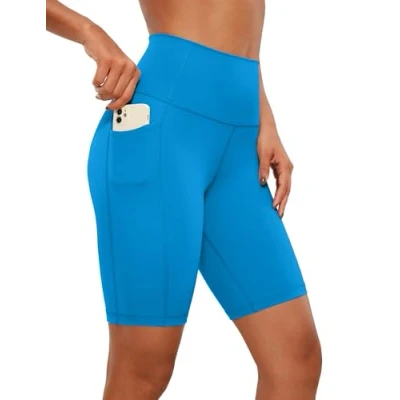 CRZ Yoga Women's Naked Feeling 8'' Shorts with Pockets High Waisted Gym Cycling Fitness Madagascar Blue 8